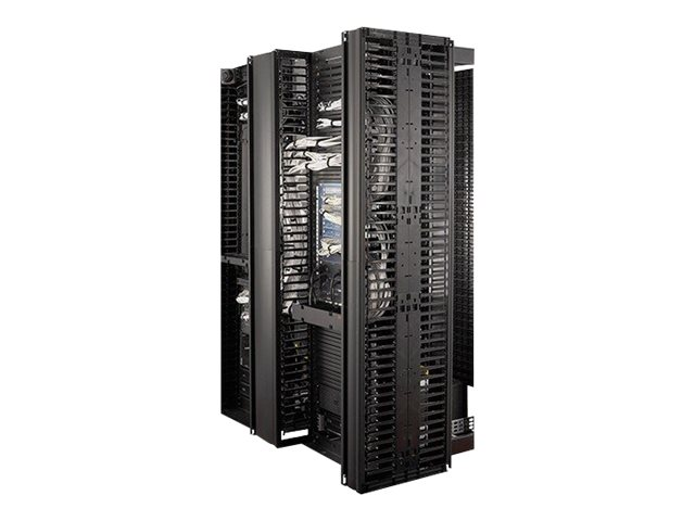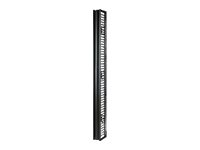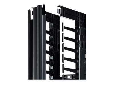 This 6" wide, high capacity vertical cable manager for 2 and 4 post open frame racks features a single-sided cable channel with multiple internal cable tie-off locations and smooth plastic fingers at 1 U increments for organized patching applications.